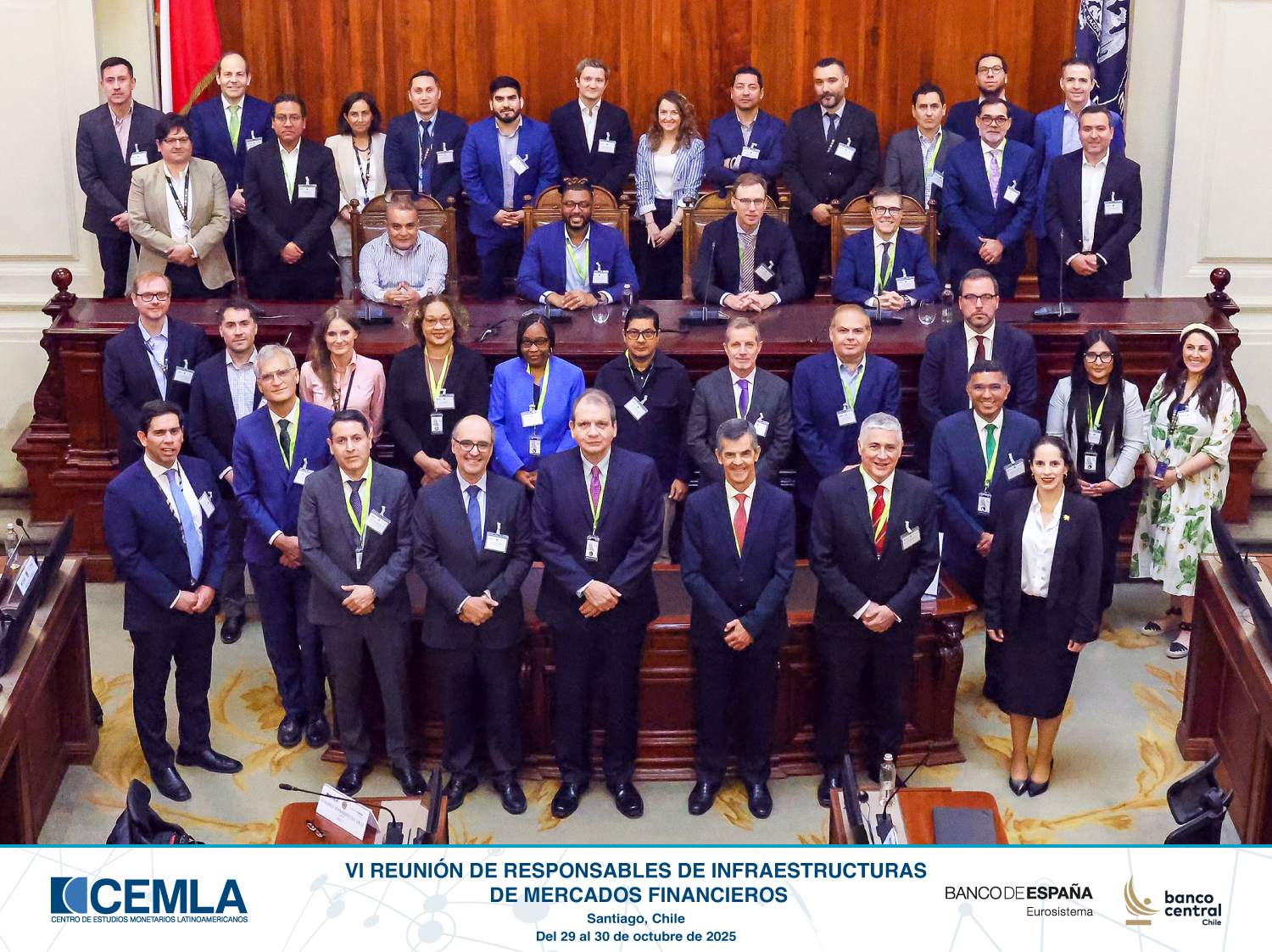 La VI Reunión de Responsables de Infraestructuras de Mercados Financieros, organizada por CEMLA, se llevó a cabo de manera presencial en Santiago de Chile los días 29 y 30 de octubre de 2025, reuniendo a jefes de departamento y expertos de bancos centrales de la región especializados en pagos e infraestructuras del mercado financiero. El encuentro se desarrolló con interpretación simultánea español–inglés y tuvo como eje central los desafíos y oportunidades derivados de la innovación tecnológica en los sistemas de pago y liquidación.